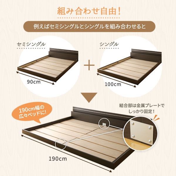 ■サイズ・色違い・関連商品 セミシングル シングル フレームのみ マットレス付き(4種) フレームのみ マットレス付き(4種) セミダブル ダブル フレームのみ マットレス付き(4種) フレームのみ マットレス付き(4種) キング(SS+SS) ワイドキング190(SS+S) フレームのみ マットレス付き(4種) フレームのみ マットレス付き(4種) ワイドキング200(S+S) ワイドキング210(SS+SD) フレームのみ マットレス付き(4種) フレームのみ マットレス付き(4種) ワイドキング220(S+SD) ワイドキング230(SS+D) フレームのみ マットレス付き(4種) フレームのみ マットレス付き(4種) ワイドキング240(SD+SD) ワイドキング260(SD+D) フレームのみ マットレス付き(4種) フレームのみ マットレス付き(4種) ワイドキング280(D+D) フレームのみ マットレス付き(4種) ■商品内容■家族のスタイルにあわせて選べる単品4サイズと連結式9サイズの計13サイズ展開。