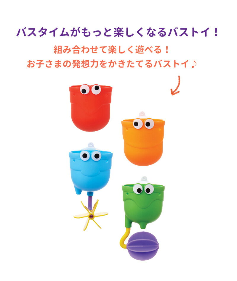 すくったり、壁にくっつけたりと遊び方が自由自在! 水をながすと穴からちょろちょろでてきたり、プロペラがクルクルまわるよ! カップで水をすくったり吸盤で壁にくっつけたり! カラフルでキュートなアイテムはプレゼントやギフトにもピッタリです♪